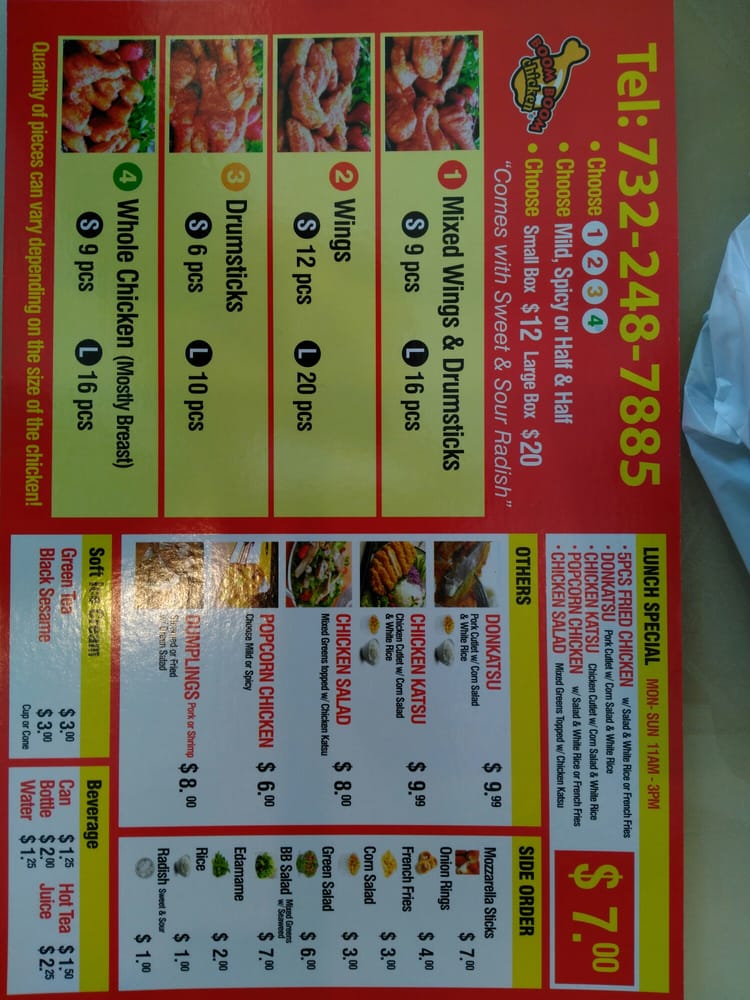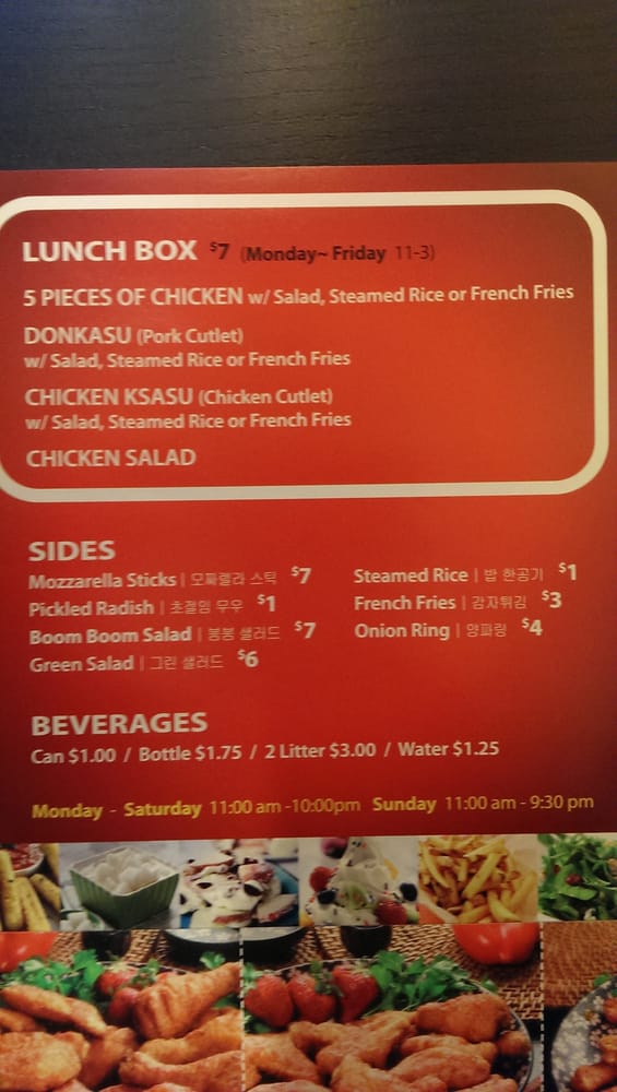 Introducing the menu at Boom Boom Chicken, located in Edison, NJ, offers a delectable array of Korean chicken wings. With options for delivery, takeout, and reservations, this casual dining spot provides a range of vegetarian choices, along with good seating and parking facilities. Customers rave about the crispy and flavorful chicken, along with standout sides like rice, fries, and salads. The menu boasts various combo options, ensuring a satisfying meal for groups and families. The unique blend of sweet and spicy flavors in the chicken wings is a highlight, paired perfectly with crunchy sides. Despite occasional waits, the food quality and ambiance make Boom Boom Chicken a must-visit for fried chicken enthusiasts.